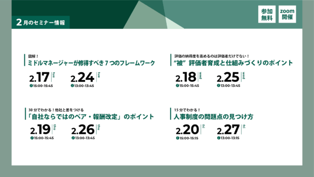 さて、2月も複数のテーマでセミナーを開催します。貴社の人事施策の在り方を検討・見直す機会として活用いただけると幸いです。皆様の参加をお待ちしております。